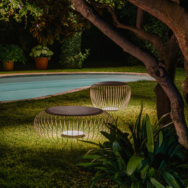 Meridiano, ein Design von Jordi Vilardell & Meritxell Vidal lädt dazu ein, sich den magischen Leuchteffekten zu nähern und sie aufzunehmen. Die Struktur aus geschwungenen Stahlstäben in Khaki, Cremeweiß oder Grün ist mit einer unsichtbaren LED ausgestattet, die aus ihrer Abdeckung heraus ein indirektes Umgebungslicht abgibt. Über eine Wiese verteilt verziert Meridiano das Gelände mit raffinierten Mustern aus Licht und Schatten. Werden hingegen zwei oder drei Leuchten strategisch zu den Blumentöpfen im Hof gestellt, führt dies zur Betonung der umgebenden Texturen und organischen Formen.
