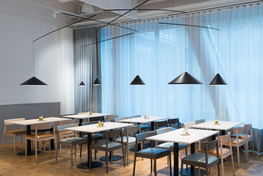 In the restaurant, Wireflow Lineal was perfect along a long white wall because of its graphic effect. Suddenly a boring wall turned really interesting! The North pendant, Wireflow Free Form and Suite floor lamps were also used in this project to create unexpected design combinations. The mix of different but still matching fixtures was important to achieve the dynamic impression we wanted.