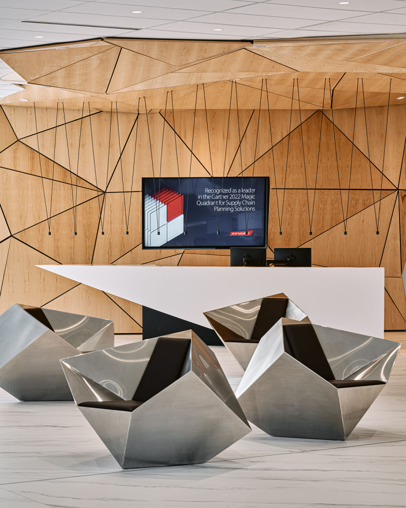 The fractal geometry of the office reception is expressed in the wall and ceiling cladding as well as the furniture. The Match pendant lighting system designed by Jordi Vilardell and Meritxell Vidal helps define the functional aspects of the space. The reception desk is illuminated and the space is calibrated by the repeated angles of the hanging cable system.