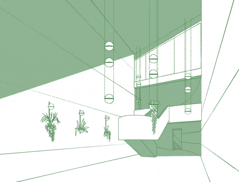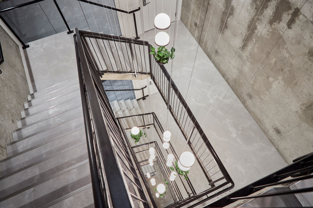 Part of sustainability in offices is trying to encourage people to use the stairs, as part of a physical exercise regime. This staircase becomes an attractive alternative to the lift by hanging the Palma pendant light within the central void. What would normally be a building regulations requirement is now something more, a beautiful space and a great excuse to take the stairs.