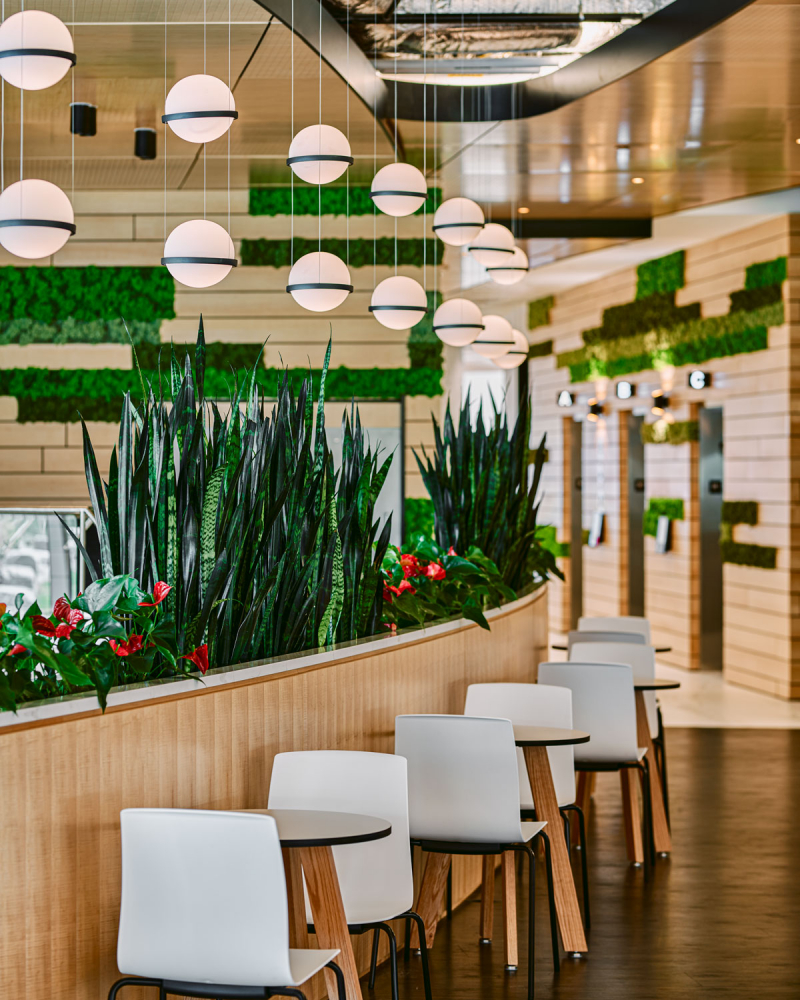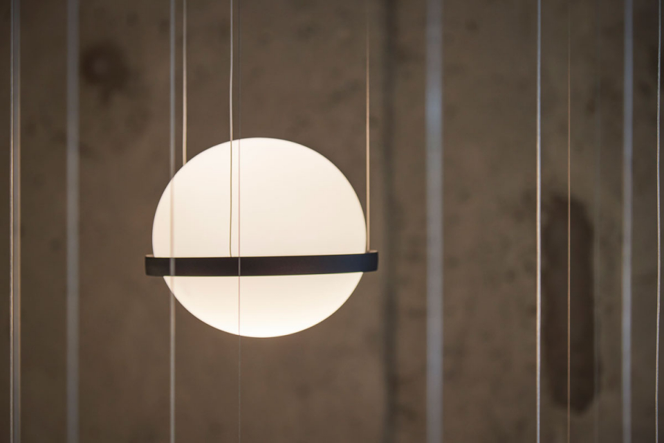 The office canteen is planted with abundant greenery featuring natural materials to help define this separate programme. The Antoni Arola designed Palma pendant light in glass and metal captures the classic and timeless expression of raw light. Forms and materials that remain unchanged no matter how technology advances, just like being with one another and meeting face-to-face over a coffee.