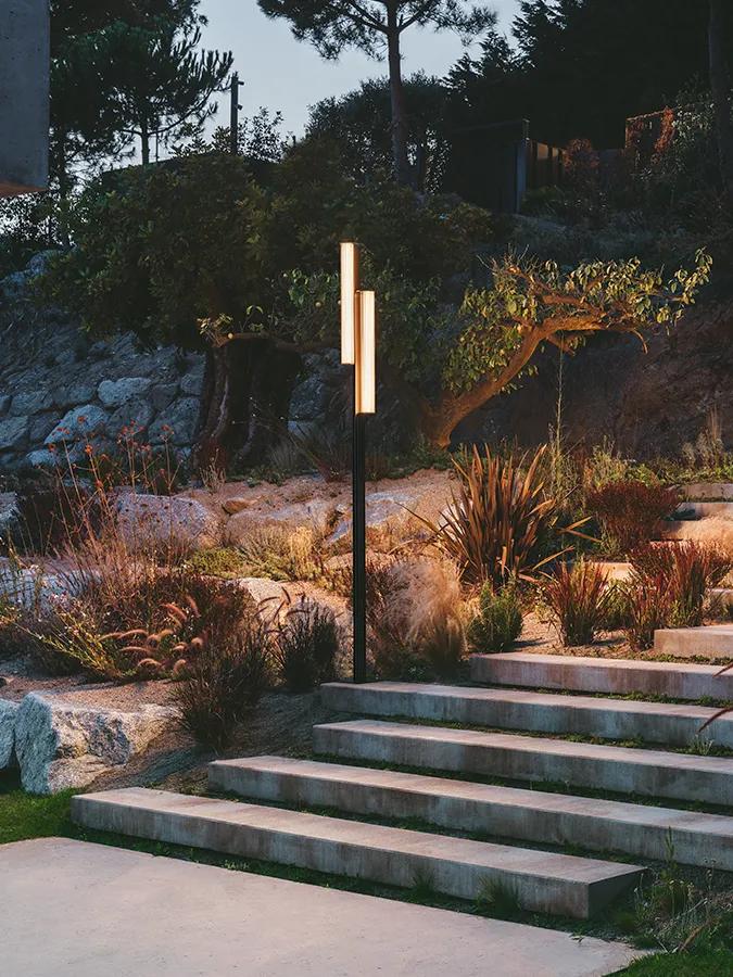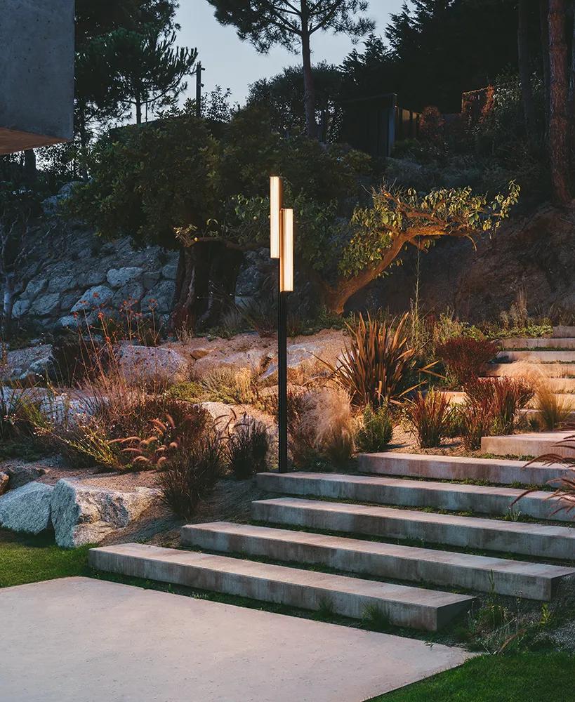 En lugar de integrarse silenciosamente en el jardín, la lámpara de pie para exterior Class se alza elegante y orgullosa, y su luminaria cilíndrica de vidrio irradia una luz suave y difusa. La tira de luces LED con control de atenuación está encapsulada dentro de cada tubo.