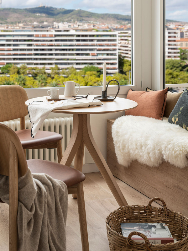 Integrándose a la perfección en el interiorismo del apartamento, dos plafones de la colección Duo se posan sobre la mesa del comedor para iluminarlo con una suave luz directa. Esta luminaria diseñada por Ramos & Bassols combina una carcasa metálica mate en blanco con un revestimiento de madera en el interior, aportando intimidad y atrayendo las miradas de sus huéspedes.