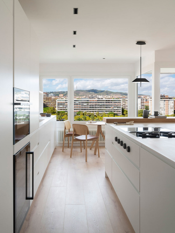 En este juego de contraste entre romanticismo e informalidad participa Mayfair desde lo alto de la isla de la cocina: la luz natural de la panorámica a la ciudad condal se cuela en el que es el cubo central del hogar y se fusiona con las livianas líneas de este diseño colgante de Diego Fortunato.