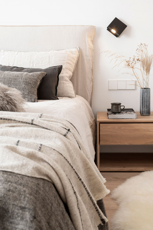 También diseñada por Ramos & Bassols, Alpha cobra vida propia en el dormitorio de esta residencia. De líneas puras y sencillas y con un toque sofisticado, este simétrico aplique de pared proyecta un efecto lumínico 360º, ideal para crear atmósferas alrededor de la cama, y más concretamente, de la lectura, mimetizándose con los movimientos del usuario.