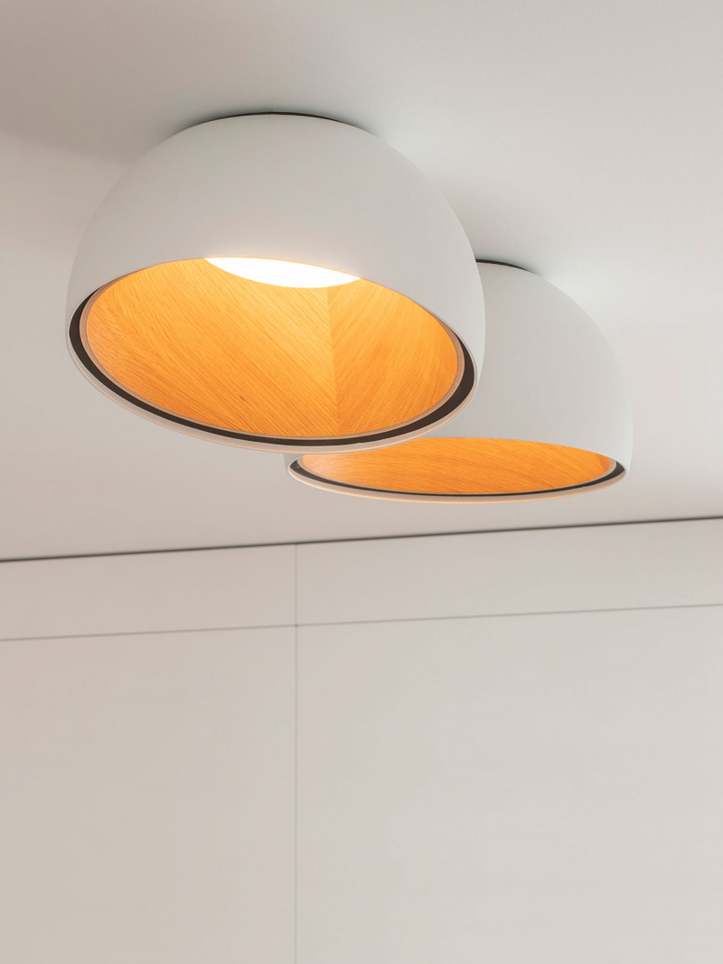 Con un diseño entre lo geométrico y lo poético, Duo actúa como reflejo del interior que Susanna Cots ha escogido para la vivienda: desde la calidez que aporta el roble a esta lámpara de techo, en sintonía con algunos de los muebles y detalles florales de la sala, hasta la materialidad industrial de su exterior, que combina con los acabados en metal de las cristaleras y los finos trazos arquitectónicos que delimitan las diferentes estancias.