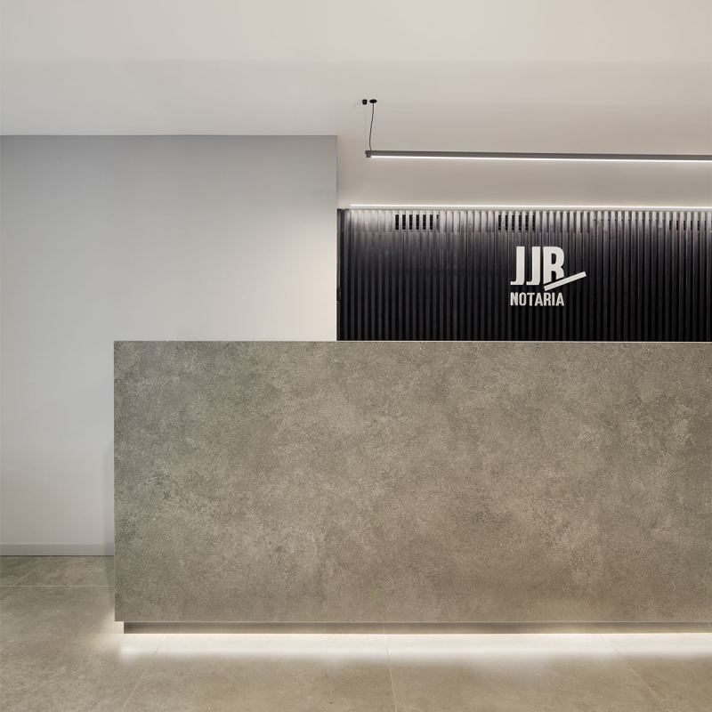 Tanto en las salas de firma como en el despacho del notario se combinan la neutralidad del pavimento cerámico y los techos de hormigón visto con un elegante mobiliario de listones de madera oscura que, junto con la iluminación lineal en forma de estructura flotante sobre las mesas que proporciona Sticks, aportan personalidad a los espacios más nobles.