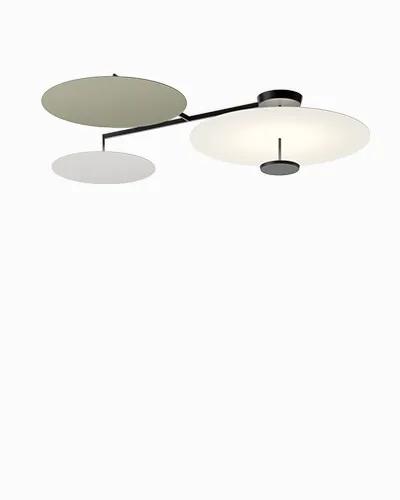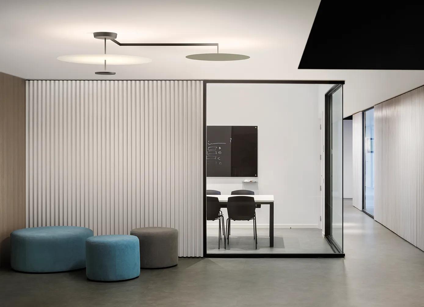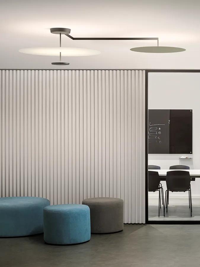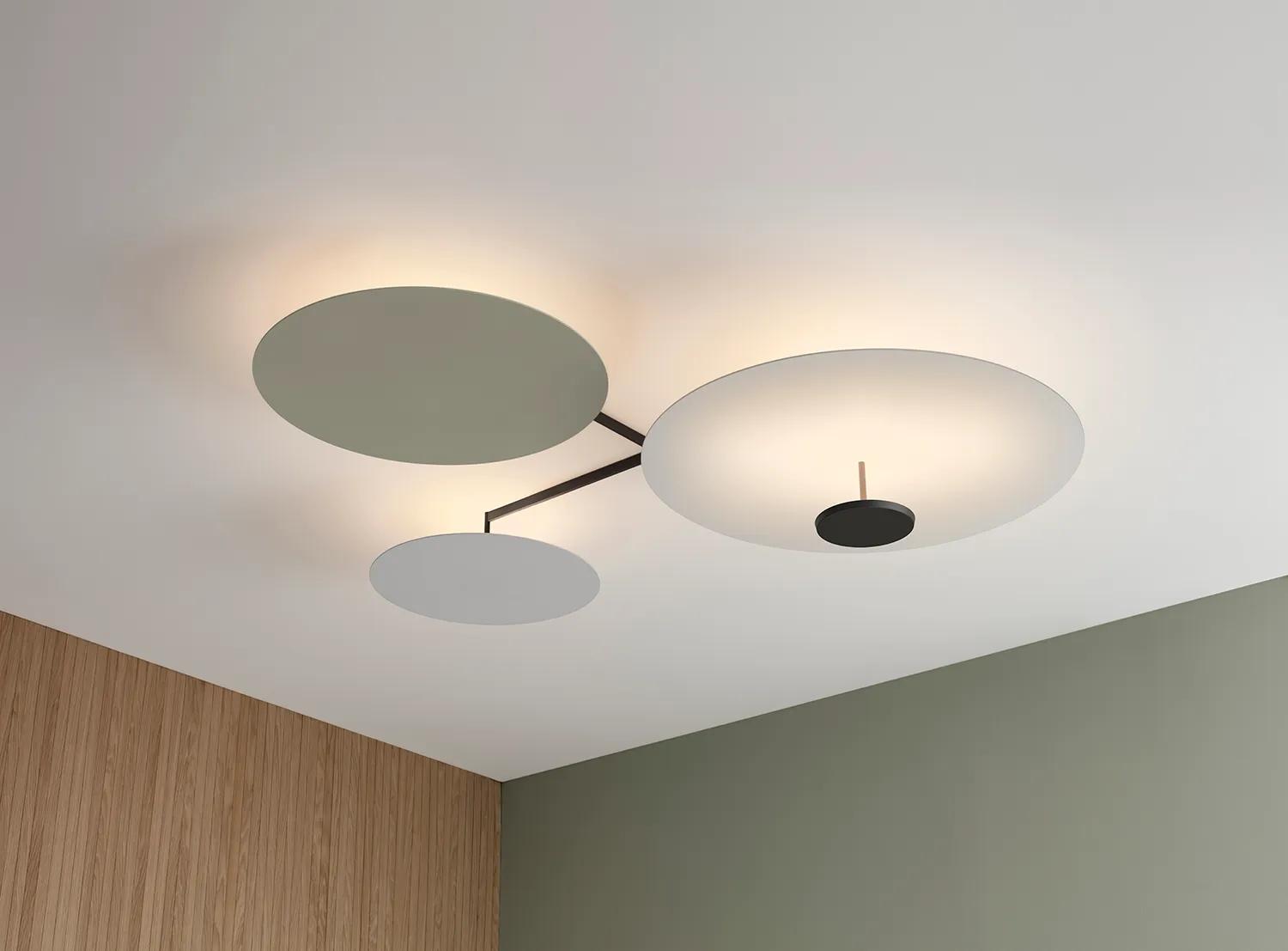The ceiling lights FLAT, with LED sources, are made from flat metal discs placed at different heights.